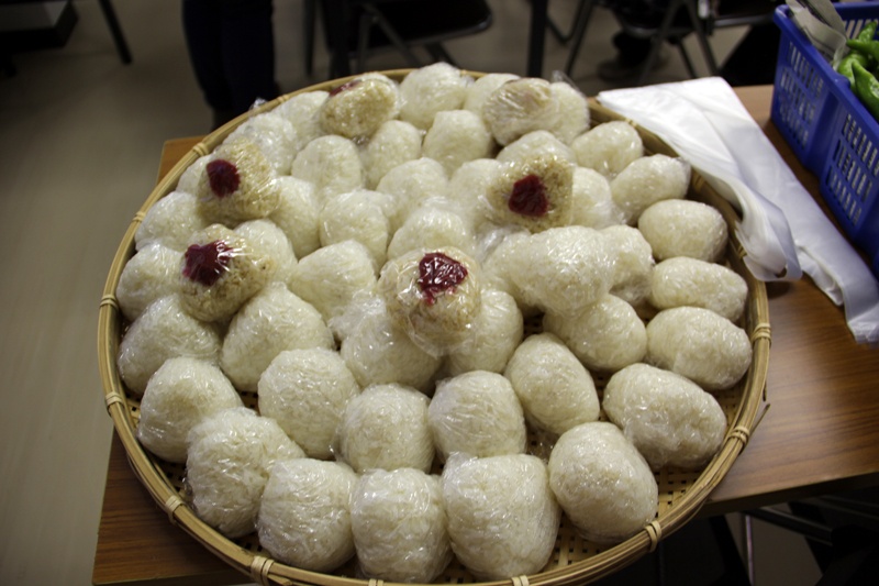試食の玄米、白米のおにぎり、米粉のケーキや草餅、豚汁をいただきながら、会長さんのお話を聞きました。