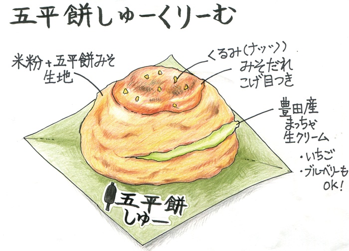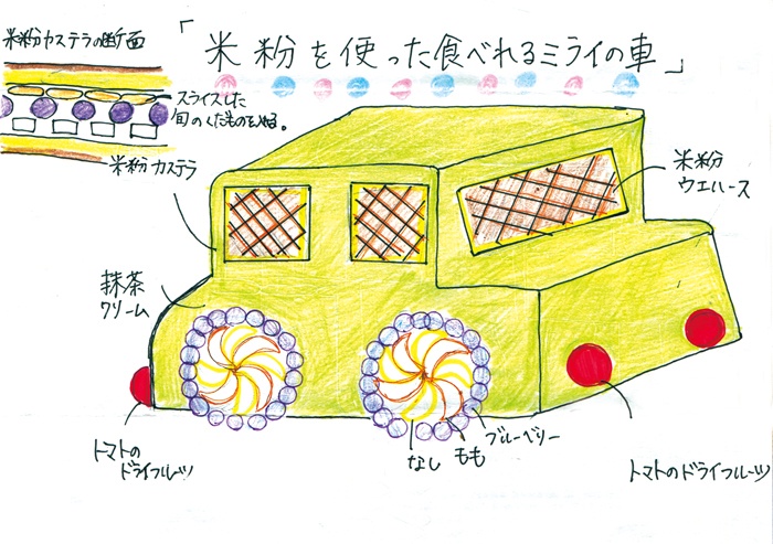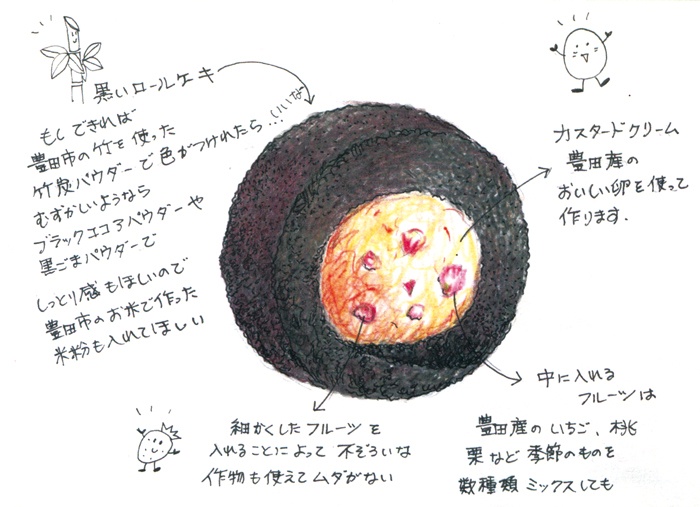 この作品は豊田の抹茶でクリーム、豊田の米粉でスポンジ生地のロールケーキでイラストも具体的で11才で豊田の食材の事を良く知っているなぁー と思い採用しました。