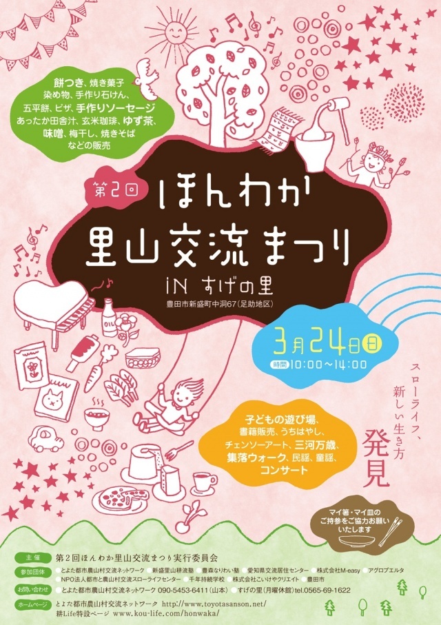 豊田市農山村での「田舎暮らし」の情報と交流を楽しんでもらう企画。田舎暮らしに関心のある多くの方に来てもらい、豊田市の田舎にかかわるきっかけとします。また、農山村地域の民間団体、関係行政関係者などが一同に会し、人的に交流することが今後も連携していくきっかけとして重要だと考えます。
